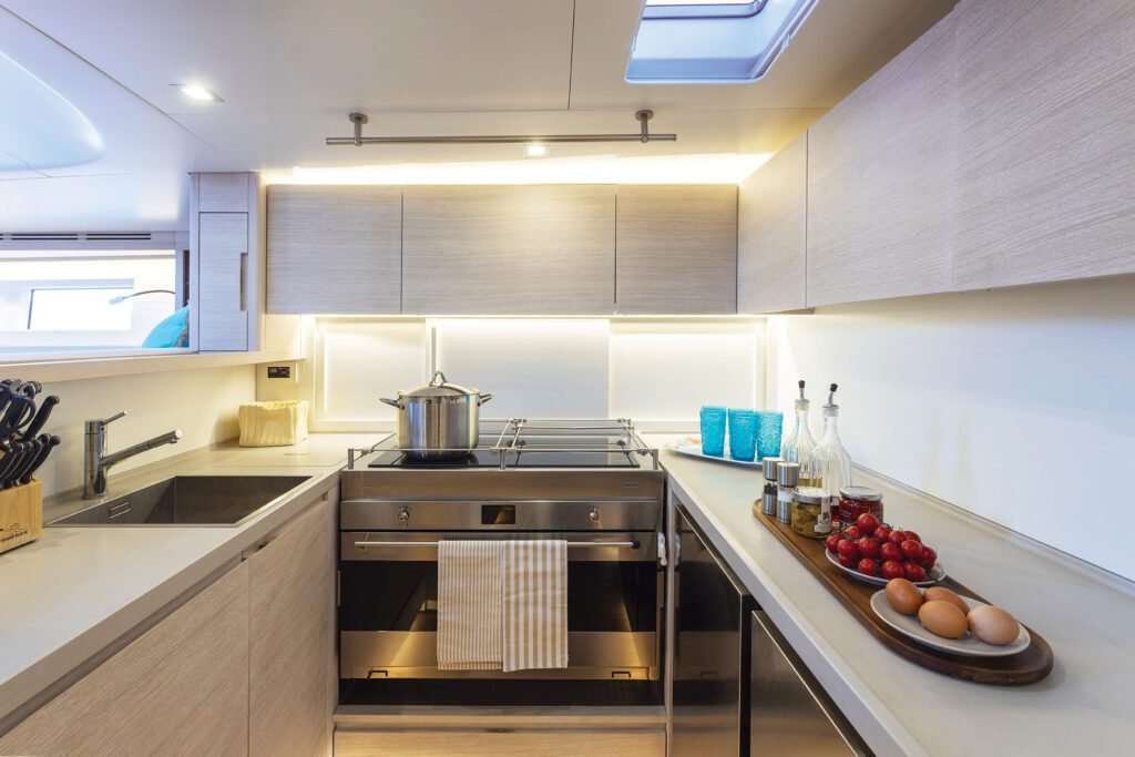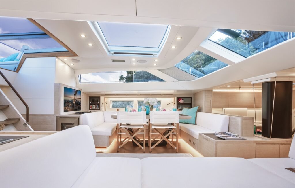 Thanks to her spacious interior volumes and advanced construction methods, MINDFULNESS stands out from similar vessels. The saloon features a breathtaking skylight, and as night falls, thoughtfully designed lighting creates an inviting, cozy atmosphere. Light oak finishes run throughout, complemented by neutral upholstery. Dining can be enjoyed at the saloon’s table, with a casual breakfast bar adjacent to the galley.